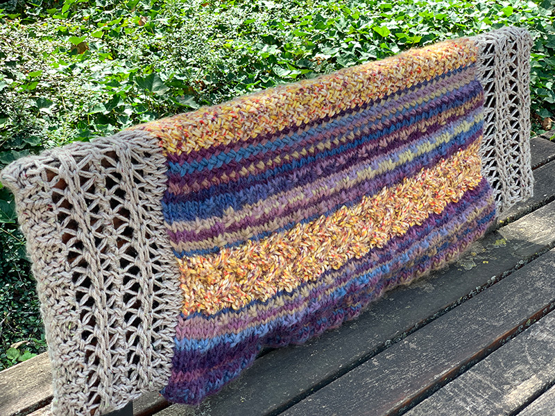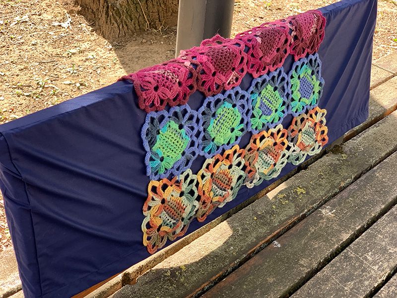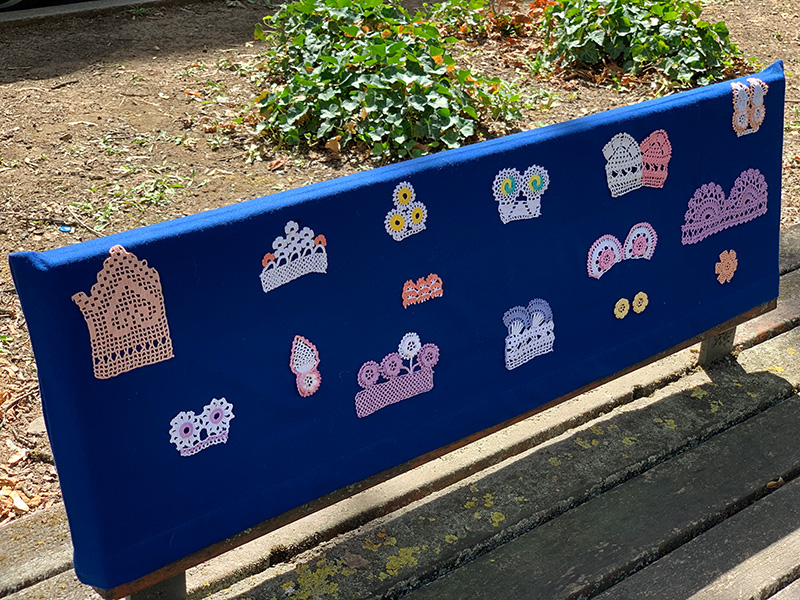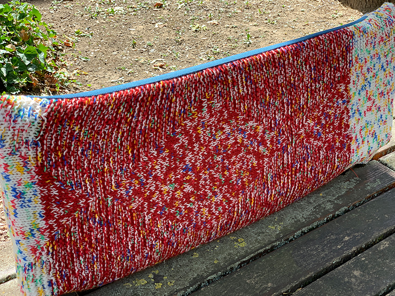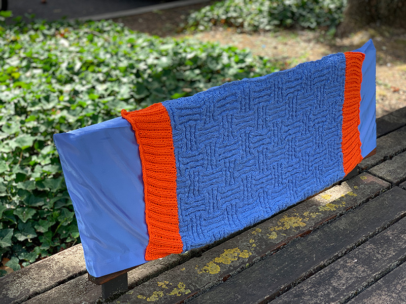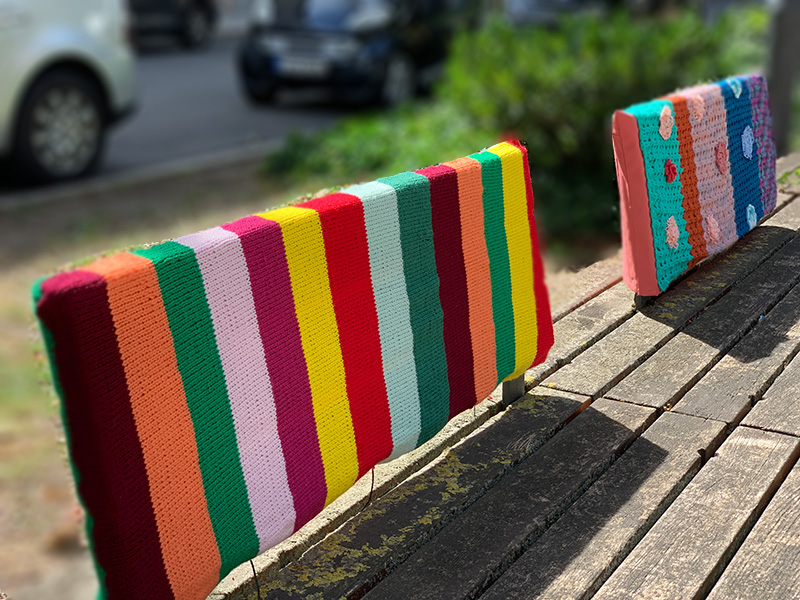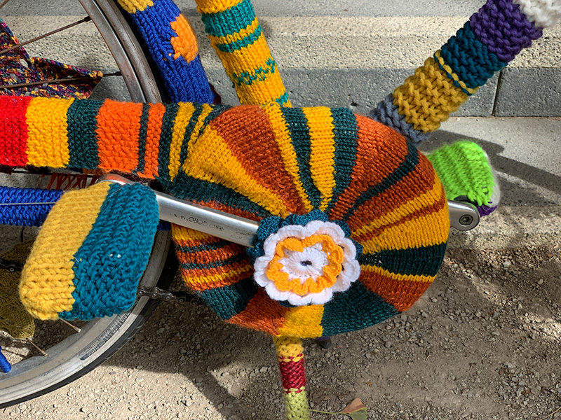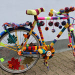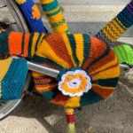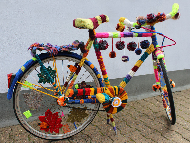 Unsere Nähwerkstatt und unsere Mitarbeiter*innen haben ein wunderschönes Fahrrad als Überraschung bei der Eröffnung des Strickwegs im Frankfurt Gallus vorbereitet.