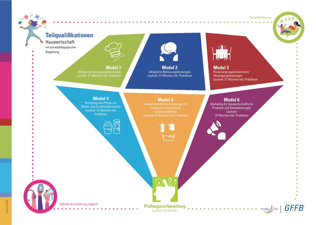 Die GFFB gGmbH bietet insgesamt sechs Teilqualifizierungen (TQ) in Teilzeit nach der neuen Ausbildungsordnung für den Beruf Hauswirtschafter*in mit sozialpädagogischer Begleitung an. Diese Teilqualifizierung kann auch für eine Zulassung zur Externenprüfung im Beruf Hauswirtschafter*in anerkannt werden und bereitet auf einen Einsatz in hauswirtschaftlichen Arbeitsbereichen vor.